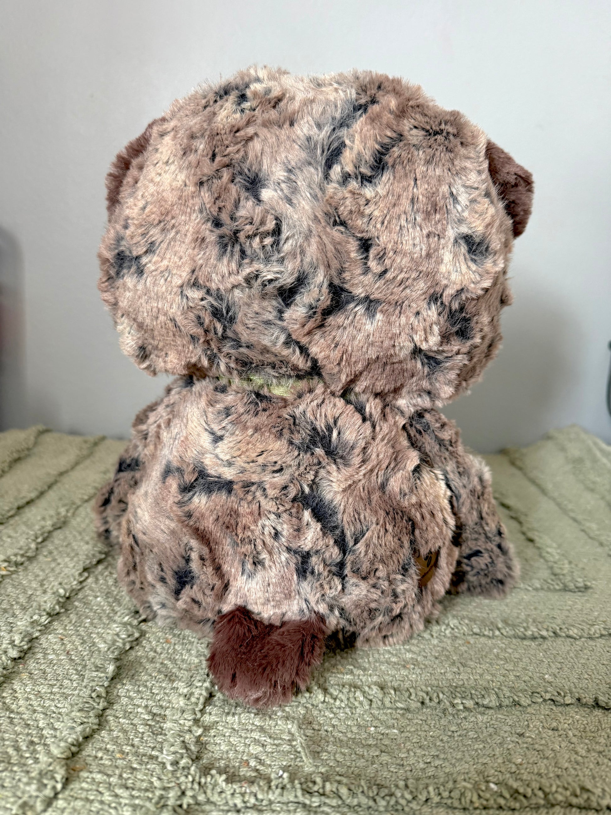 This plushie is about 12 inches tall while sitting not including the ears, is hand sewn, and weighted with glass beads in the arms and booty. Please be careful with them ! They are made for display or light cuddles, they are not made for children or rough play !!