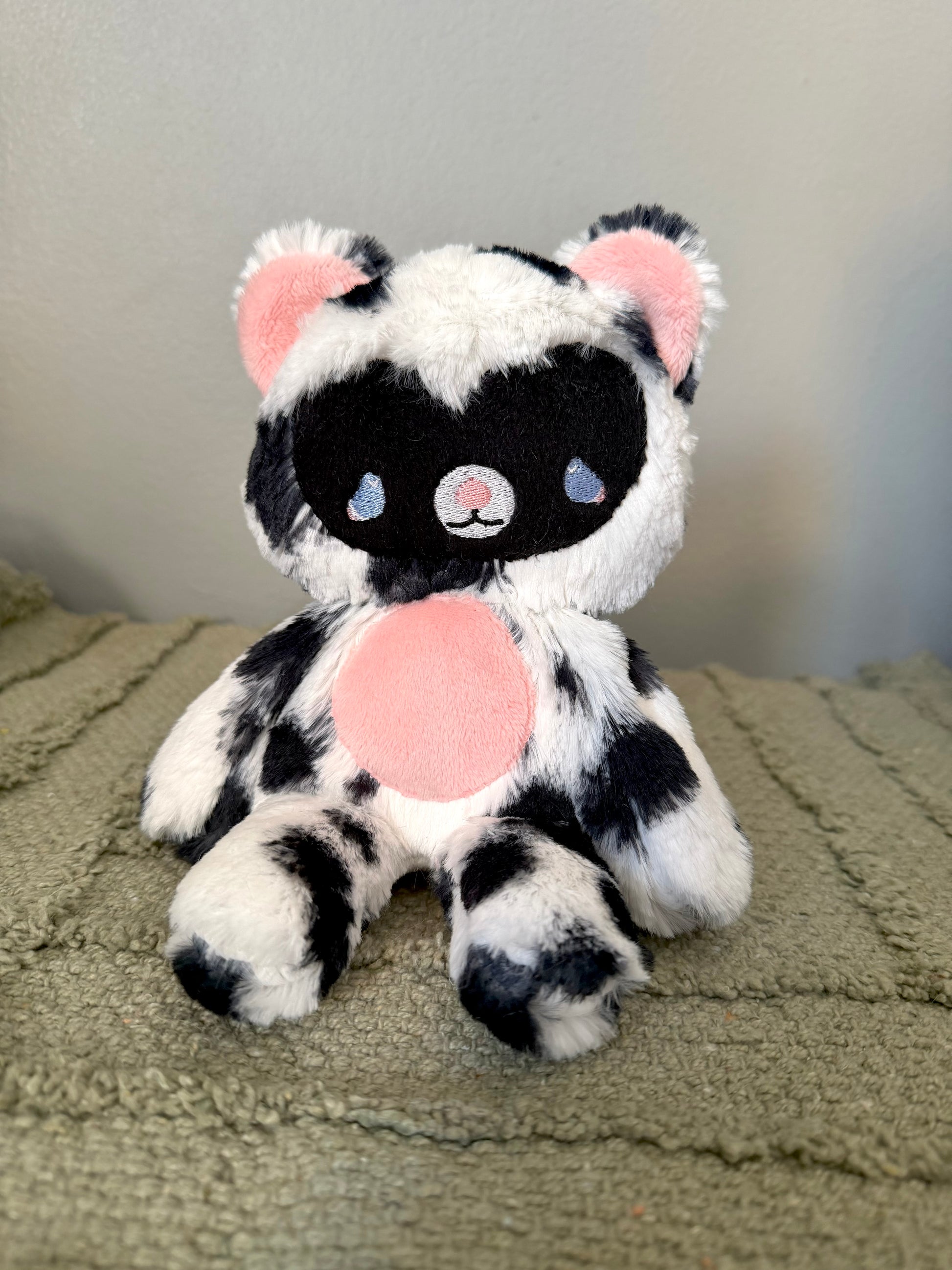 This plushie is about 6 inches tall while sitting not including the ears, is hand sewn, and weighted with glass beads in the arms and booty. Please be careful with them ! They are made for display or light cuddles, they are not made for children or rough play !!