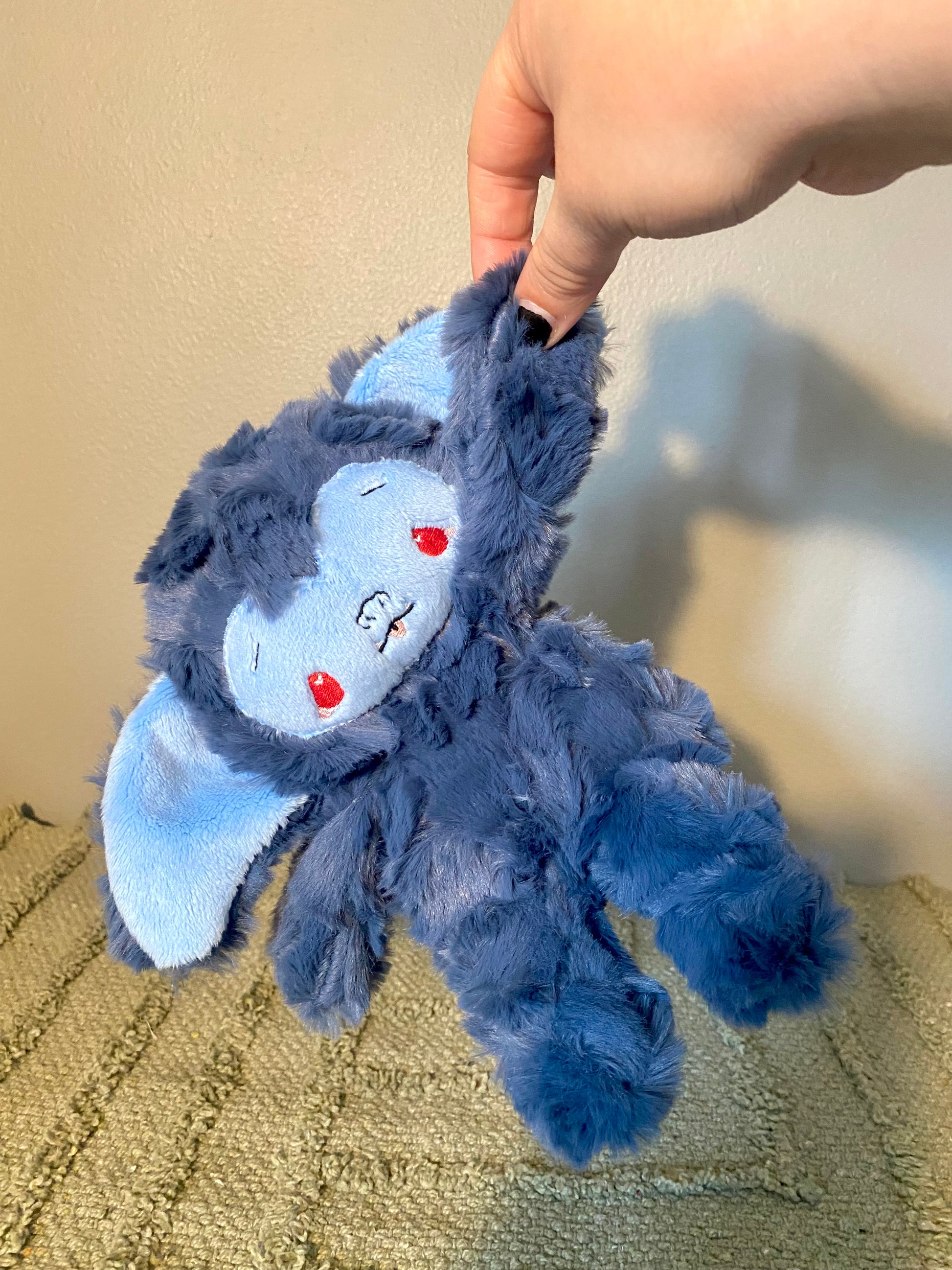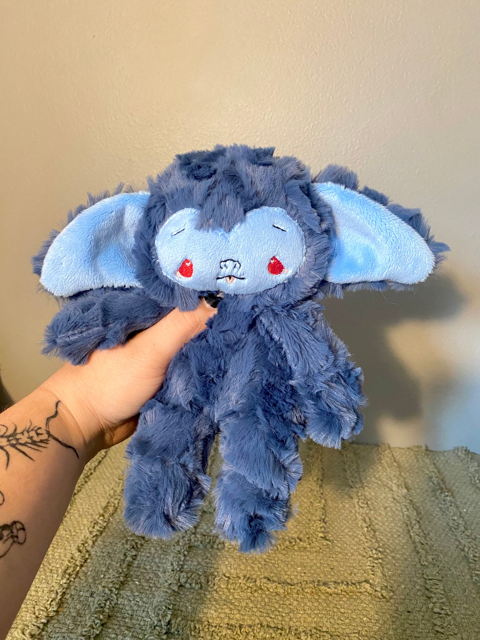 This plushie is about 6 inches tall while sitting, is hand sewn, and weighted with glass beads in the arms and booty. Please be careful with them ! They are made for display or light cuddles, they are not made for children or rough play !!