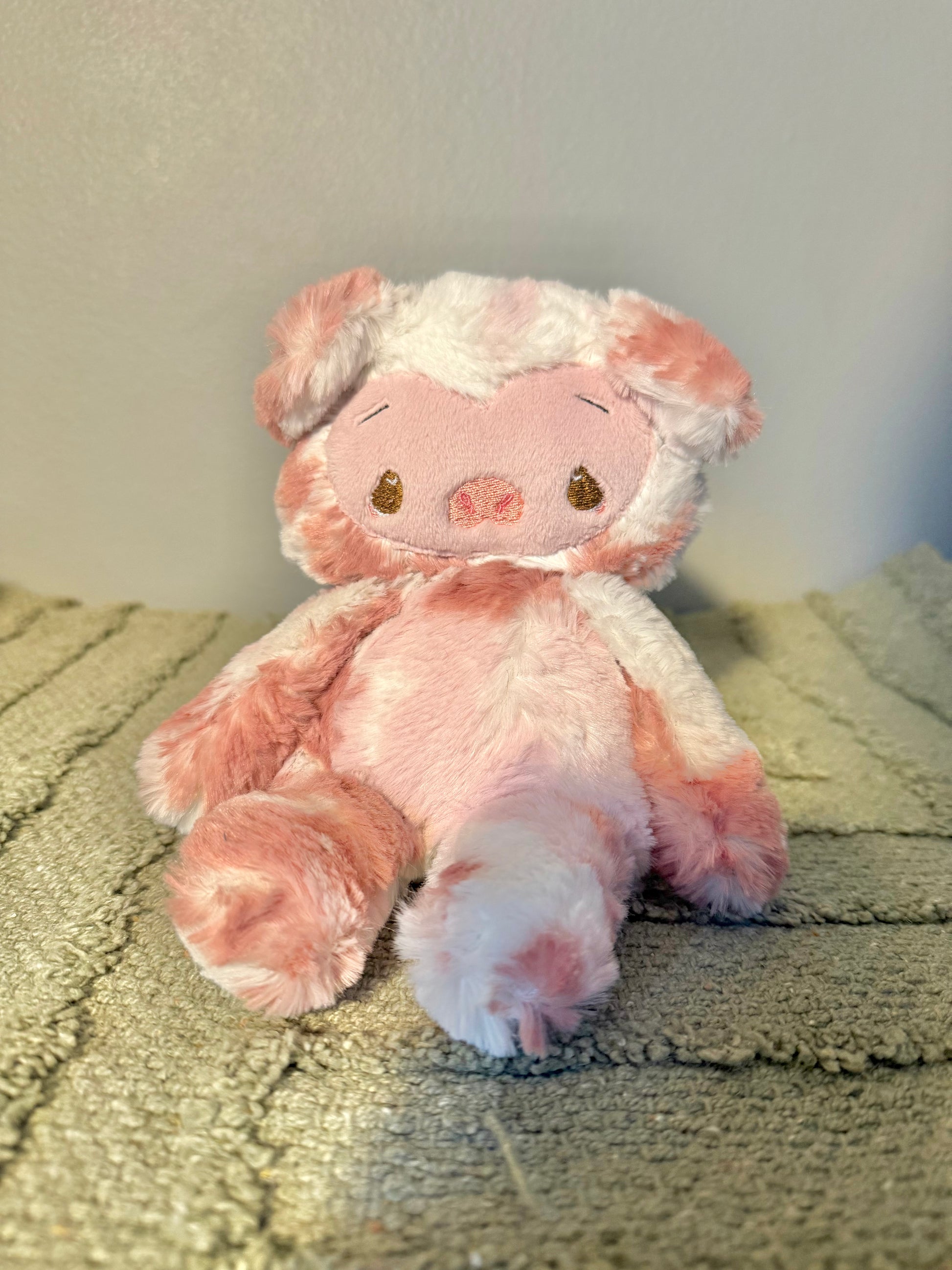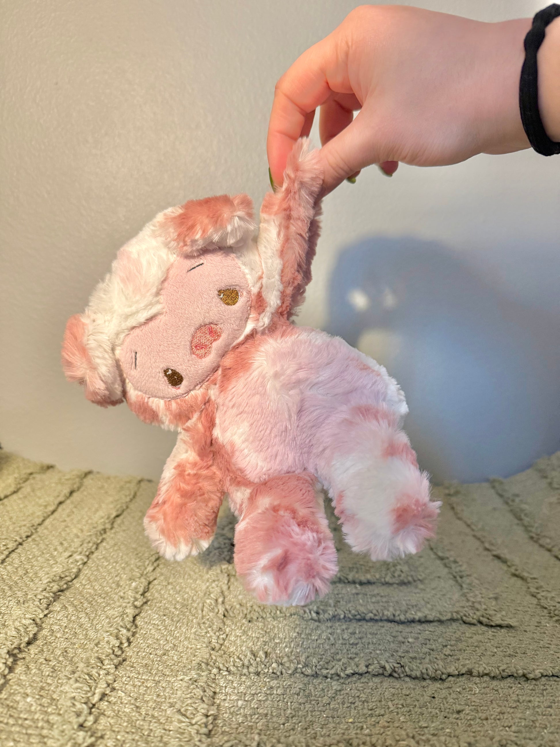 This plushie is about 6 inches tall while sitting, is hand sewn, and weighted with glass beads in the arms and booty. Please be careful with them ! They are made for display or light cuddles, they are not made for children or rough play !!
