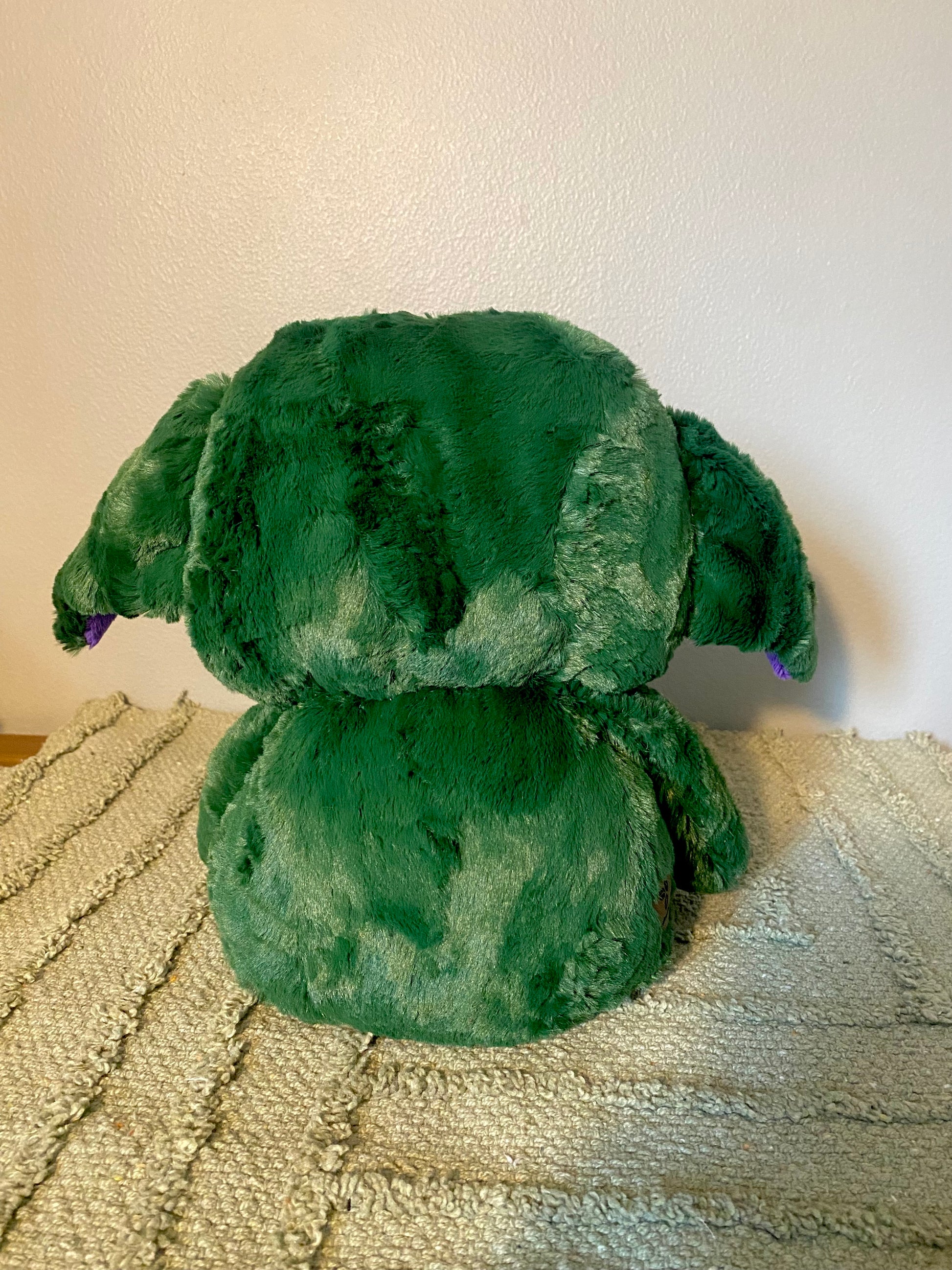 This plushie is about 12 inches tall while sitting, is hand sewn, and weighted with glass beads in the arms and booty. Please be careful with them ! They are made for display or light cuddles, they are not made for children or rough play !!